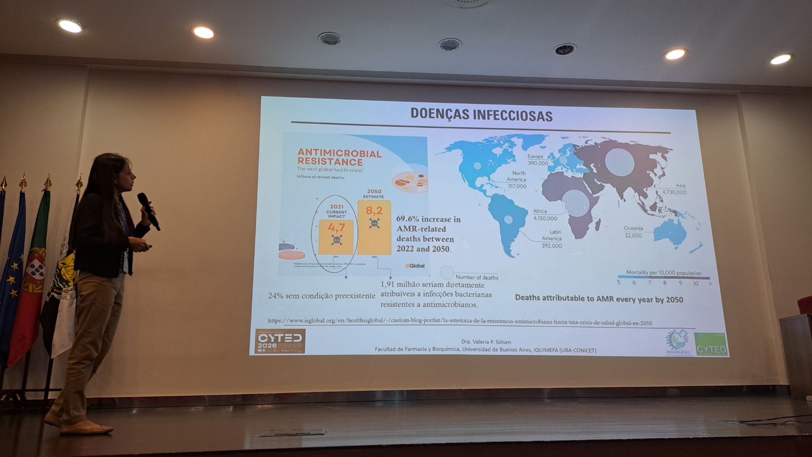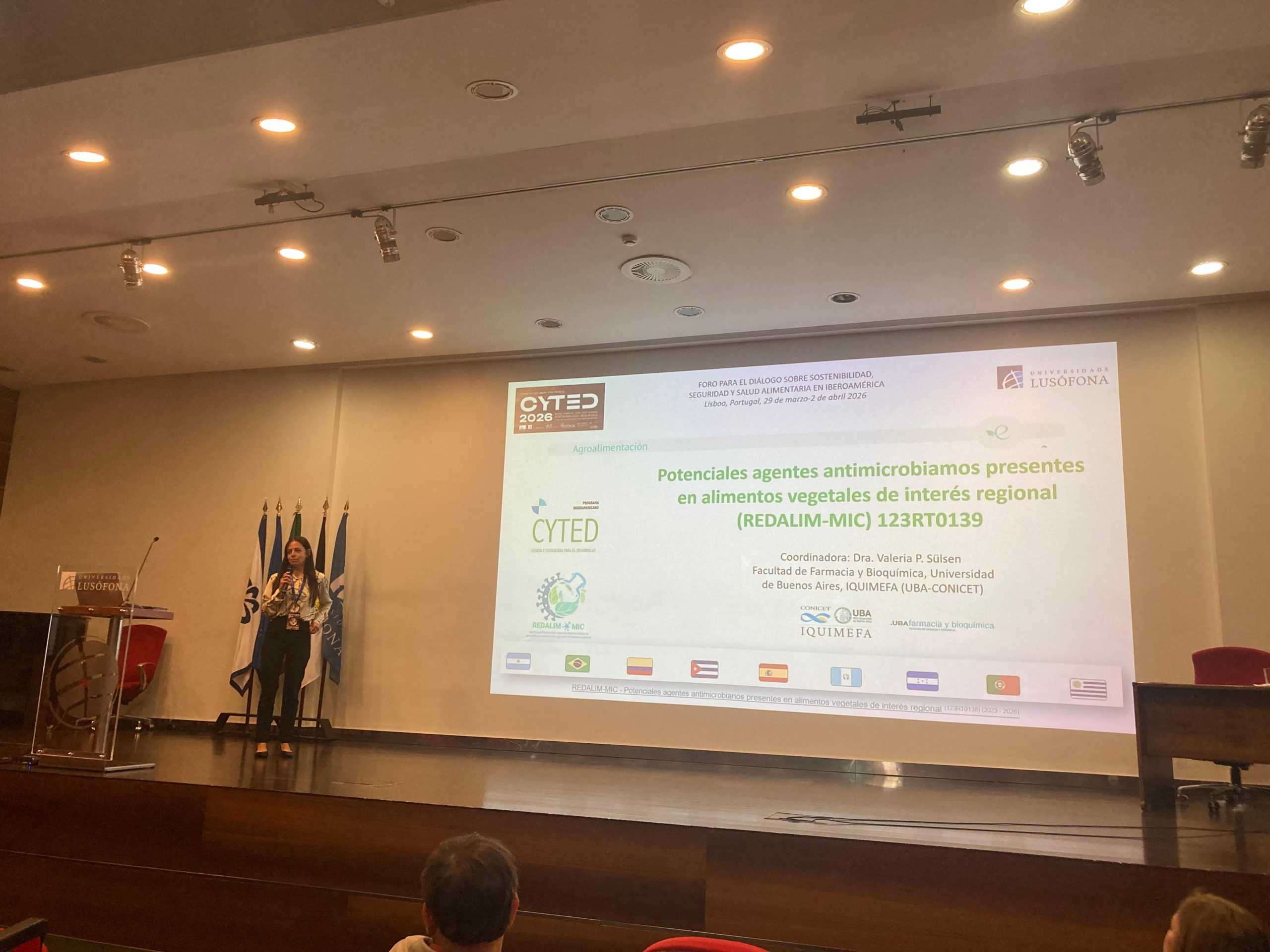 La Dra. Sülsen brindó una conferencia titulada Potencial antimicrobiano de las plantas alimentarias iberoamericanas y expuso parte de los resultados y avances de la Red REDALIM-MIC que coordina. Además, actuó como moderadora del Workshop Innovación para la sostenibilidad de la cadena de valor alimentaria.